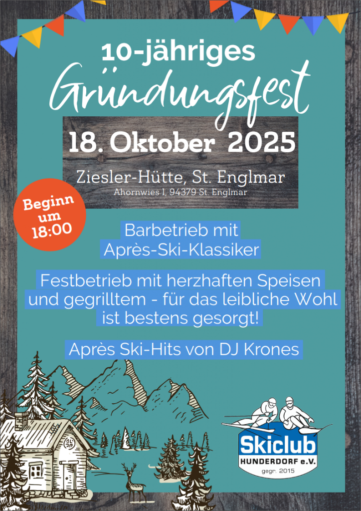 Home Events 10. Jähriges Gründungsfest 10. Jähriges Gründungsfest Hüttenfest zum 1o-jährigen Jubiläum. 00 Tage 00 Stunden 00 Minuten 00 Sekunden Datum Okt. 18 2025 - Okt. 19 2025 Uhrzeit 6:00 pm - 2:00 am Ort Skihütte Ahornwiese 1 Sankt Englmar Kategorie Ohne Anmeldung Diese Veranstaltung teilen